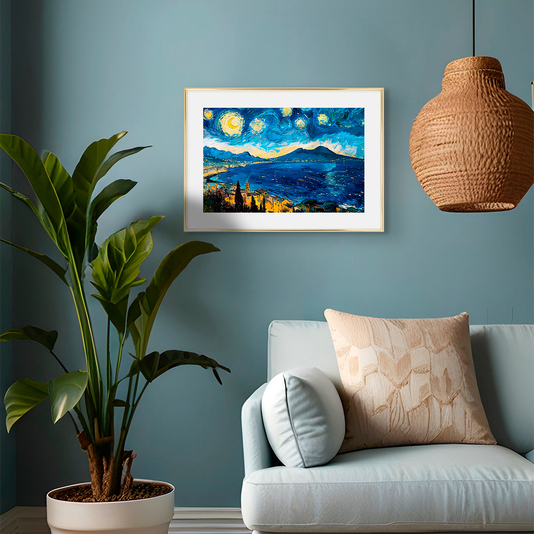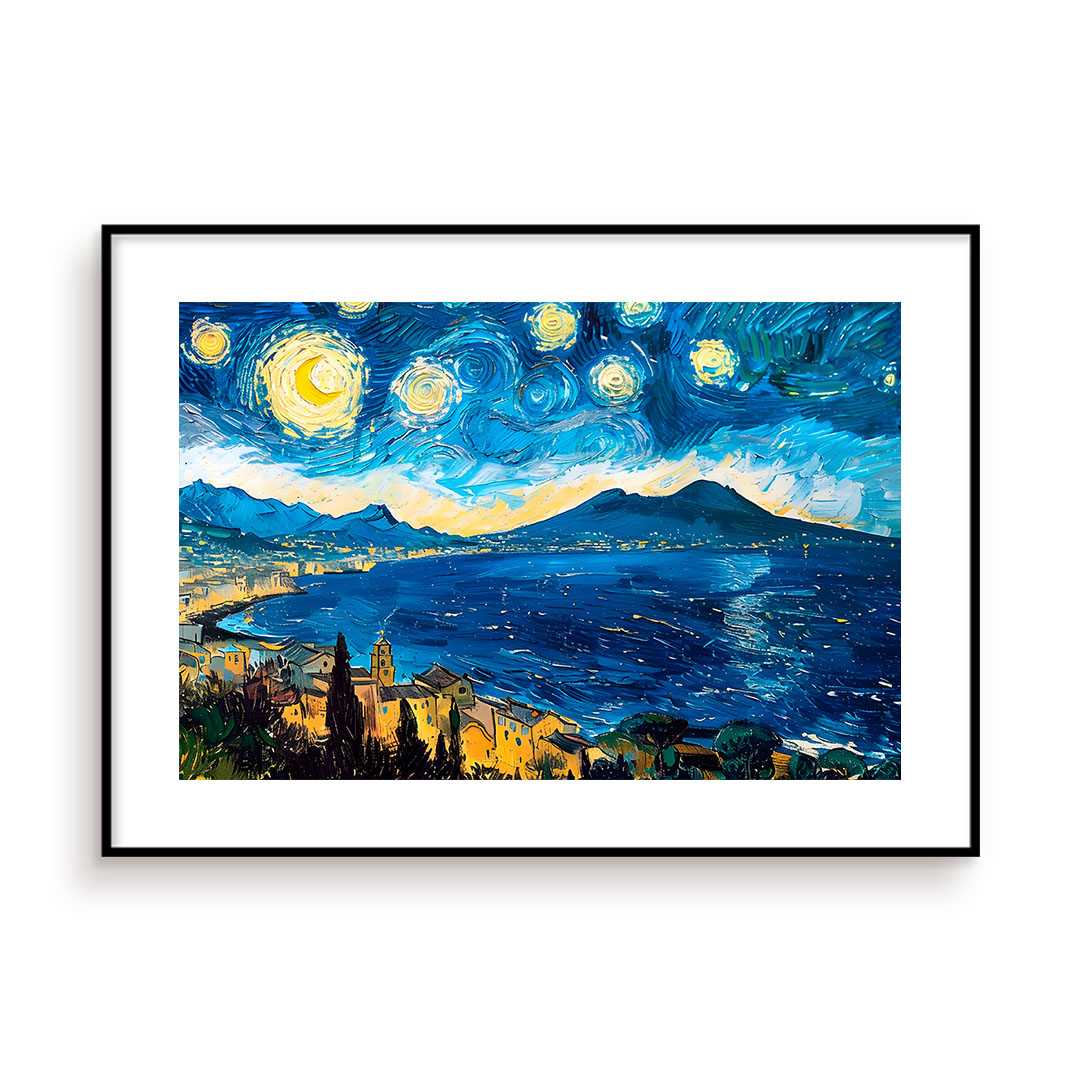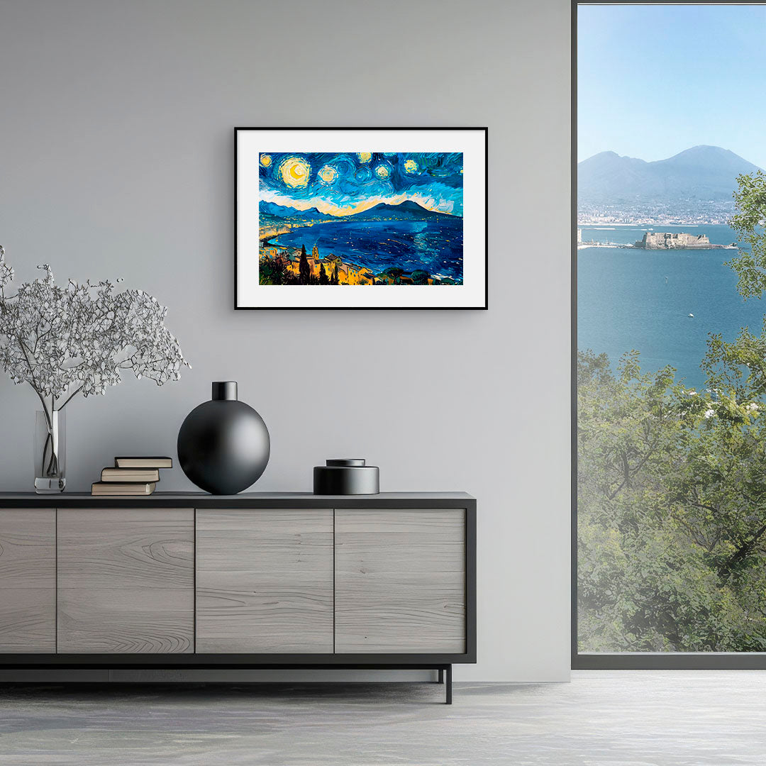 Al posto delle colline provenzali, s'innalza il Vesuvio, con le stelle che dipingono sfumature blu e gialle di un sogno napoletano.