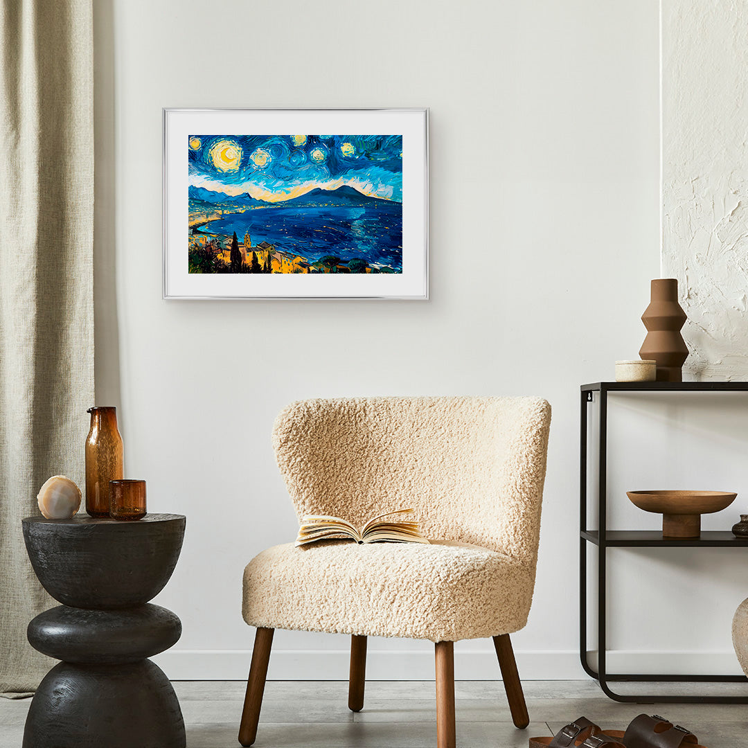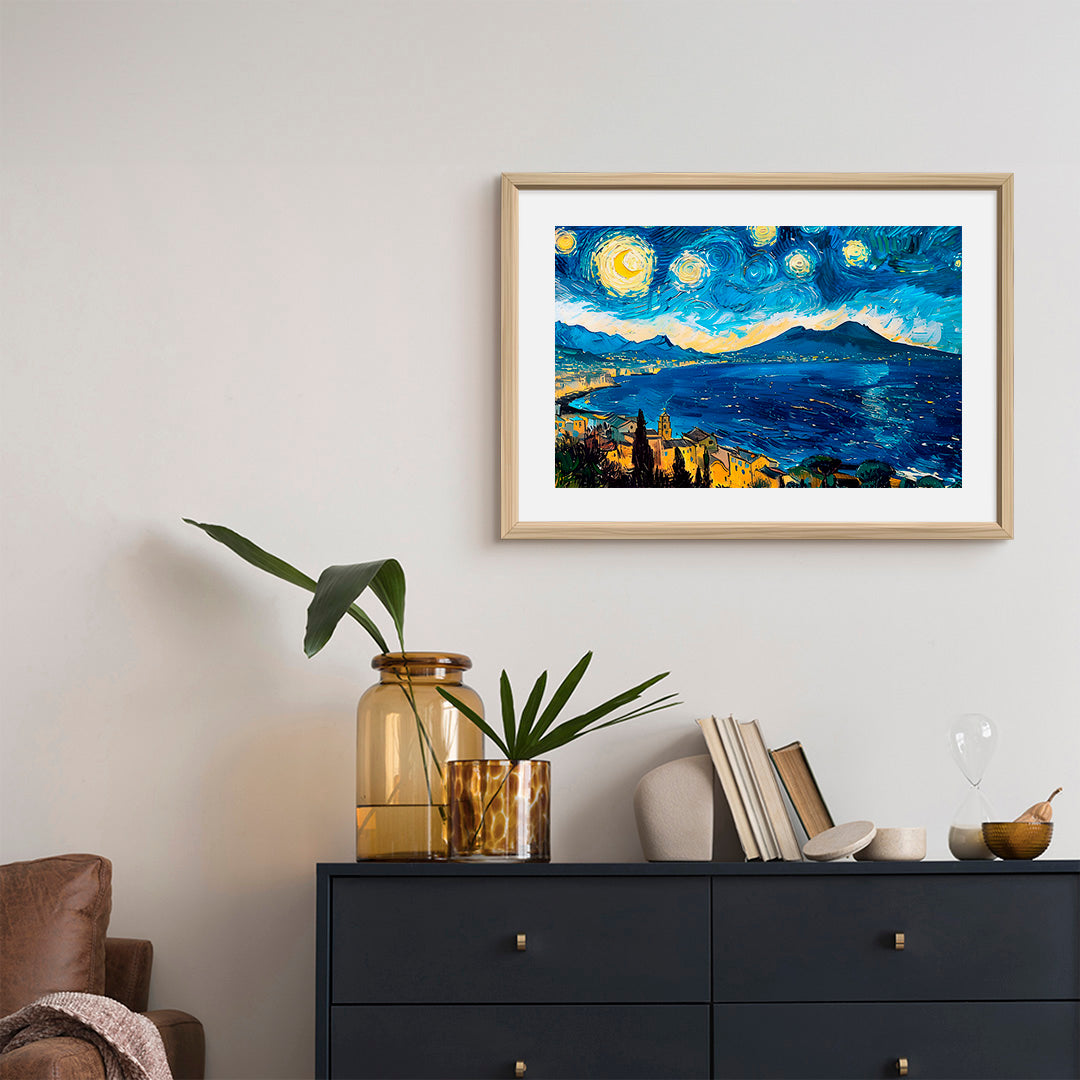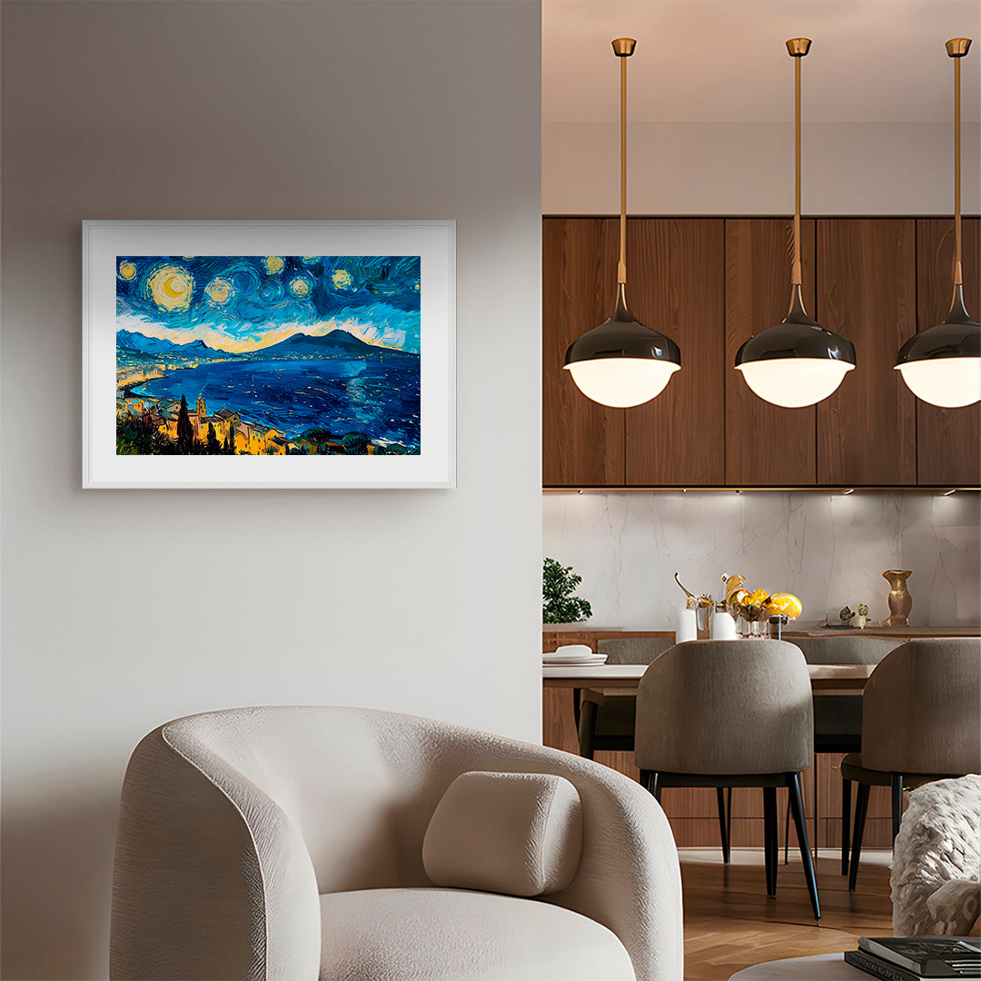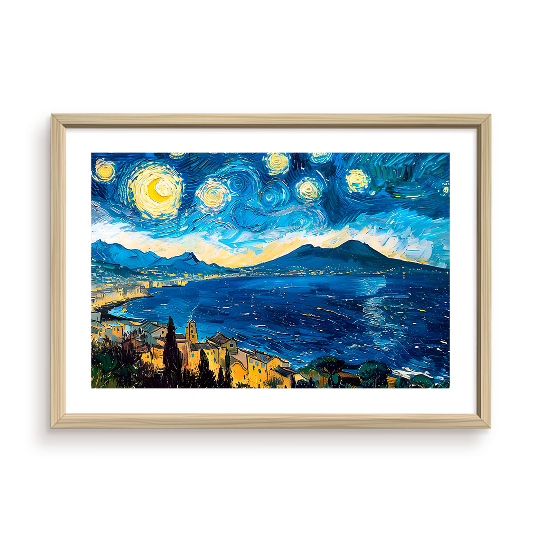 Al posto delle colline provenzali, s'innalza il Vesuvio, con le stelle che dipingono sfumature blu e gialle di un sogno napoletano.